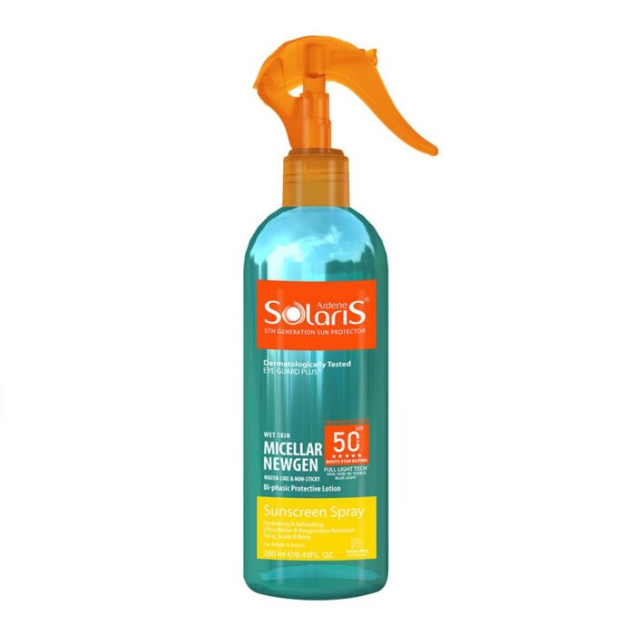 لوسیون دو فازی ضد آفتاب میسلار نیوژن سولاریس با بافتی بسیار سبک و مناسب برای پوست مرطوب می باشدکه محافظت کامل در برابر اشعه های UVB/ UVA /IR با SPF 50 بر روی پوست شما دارد. اسپری میسلار نیوژن کاملا بدون رنگ و شفاف است و به سرعت بر روی پوست خشک می شود و بدون ایجاد چربی اضافی و چسبندگی ست، به همین دلیل شن و ماسه به پوست شما نمی چسبد.ضدآفتاب میسلار نیوژن پوست شما را ابریشمی، صاف، و با پوششی فوق العاده در برابر اشعه های خورشید نگه می دارد. به لطف فناوری Wet Skin به کار رفته در اسپری میسلار نیوژن به راحتی بر روی پوست مرطوب، بدون کاهش SPF یا اثربخشی قابل استفاده است و بدون باقی گذاشتن اثر سفیدی، محافظت کاملا یکسانی بر روی پوست شما خواهد گذاشت. محصول میسلارنیوژن بر روی حیوانات تست نشده و دارای تاییدیه انجمن پوست و موی آلمان نیز می باشد.