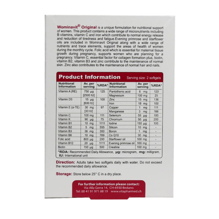 سافت ژل ومیناویت اوریجینال ویواتیون مخصوص خانم‌ها، دارای ترکیب بی نظیری از ویتامین‌ها، مواد معدنی و روغن‌های گیاهی بوده که به سلامتی و شادابی بانوان کمک می‌کند.