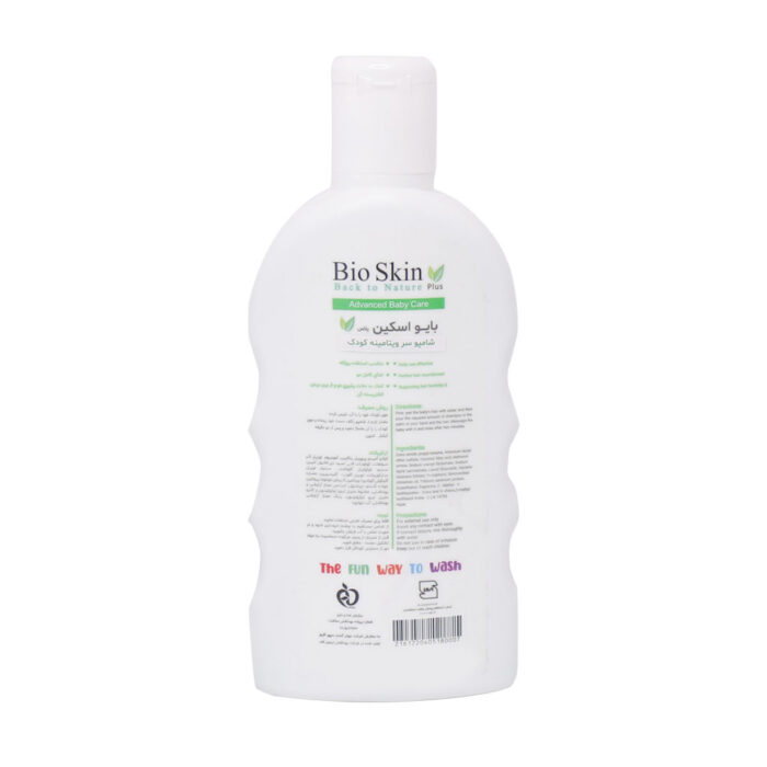 شامپو سر ویتامینه کودک بایو اسکین پلاس حاوی روغن جوجوبا و ترکیبات گیاهی موثر است و علاوه بر تمیز کردن موی کودک، الکتریسته موها را نیز از بین می‌برد. این محصول حالت پذیری مو را افزایش داده و مواد مغذی مورد نیاز را به آن می‌رساند.