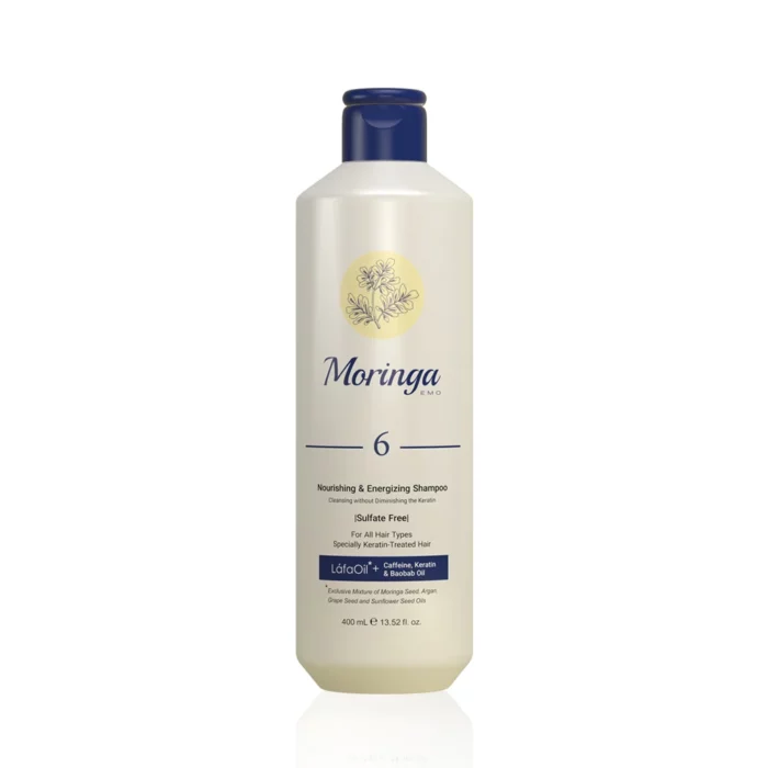 شامپو مغذی و انرژی‌بخش مورینگا اِمو 6 فاقد ترکیبات سولفات دار بوده و با شویندگی موثر به حفظ ساختار کراتین مو و افزایش ماندگاری کراتین تراپی کمک می کند. همچنین این محصول با تقویت فولیکول ها مانع از ریزش مو شده و برای استحمام روزانه وافرادی که بوتاکس، اکستنشن و ریباند مو انجام داده اند و یا دچار خستگی پوست سر و اگزما هستند نیز مناسب است.