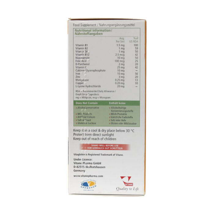 شربت ویتاگلوبین ویتان در ترکیبات خود دارای ویتامین های گروه B، ویتامین C و مواد معدنی مورد نیاز بدن می باشد. این محصول قابل استفاده برای کودکان و بزرگسالان می باشد و مکملی خون ساز است.