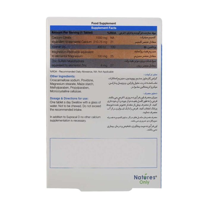 قرص سوپراکل دی نیچرز اونلی به درمان پوکی استخوان و همچنین پیشگیری از آن کمک میکند. این مکمل را در دوران بارداری و شیردهی نیز میتوان مورد استفاده قرار داد. کلسیم موجود در این مکمل به صورت سیترات است که جذب سریعی دارد.