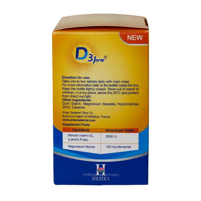 قرص ویتامین D۳ فورت ۲۰۰۰ واحد هولیستیکا از منبع طبیعی غیر حیوانی و غنی شده با منیزیم دریایی ساخته شده است. این مکمل موجب درمان پوکی استخوان، نرمی استخوان و ریکتنز می‌شود.