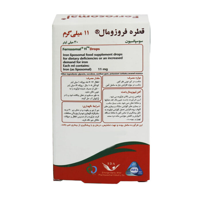 قطره آهن فروزومال ۱۱ میلی گرم سیمرغ دارو عطار آهن مورد نیاز بدن کودکان و نوزادان را به خوبی تامین می‌کند. این قطره به هیچ عنوان لکه و سیاهی روی دندان کودکان ایجاد نمی‌کند.