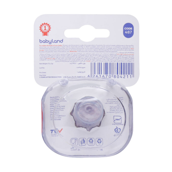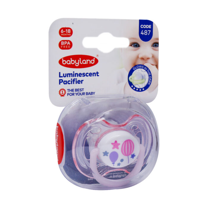 پستانک ارتودنسی بیبی لند کد ۴۸۷ با دسته شب تاب که به محض تاریک شدن میدرخشد. این پستانک از نوع ارتودنسی بوده و برای نوزادان ۶ تا ۱۸ ماه مناسب است.