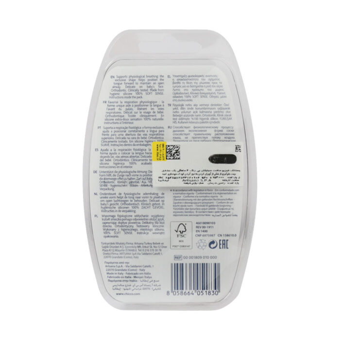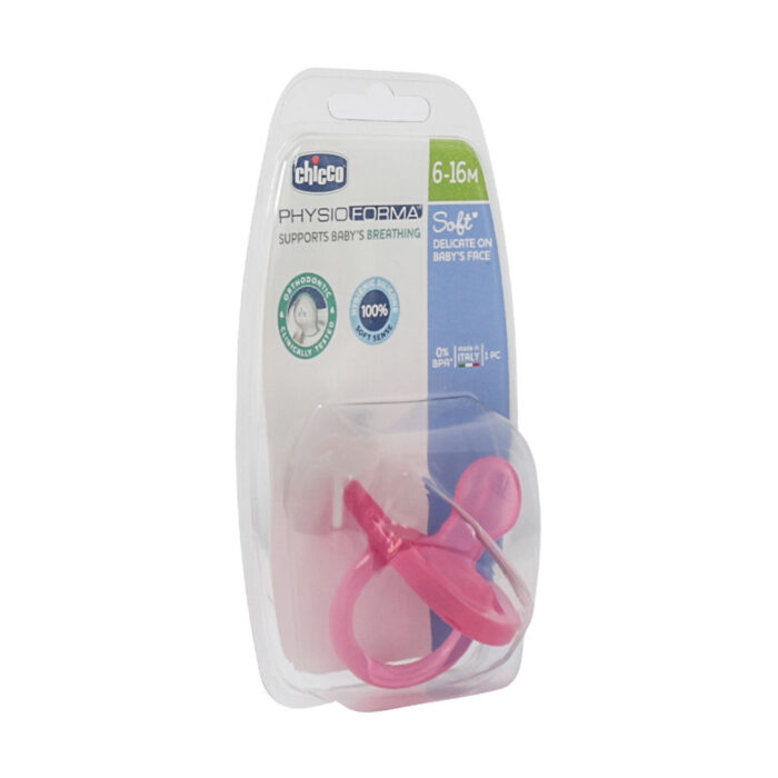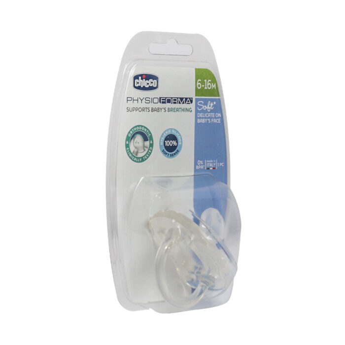 پستانک فیزیو سافت چیکو پستانک ارتودنسی است و از وارد شدن آسیب به دندان و فک کودکی جلوگیری میکند. این محصول از جنس سیلیکون بوده و دوام بالایی دارد. از ۶ تا ۱۶ ماهگی میتوان این محصول را برای کودک استفاده کرد.