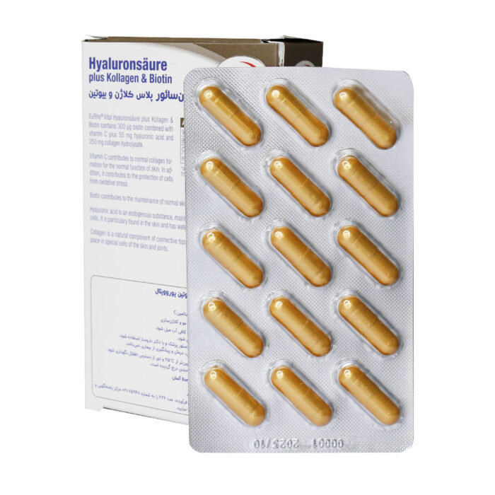 کپسول هیالورون سائور پلاس کلاژن و بیوتین یوروویتال تاثیر بسزایی در تقویت و بهبود سلامت پوست دارد. مکملی برای حفظ سلامت پوست و مو و کلاژن سازی طبیعی است.
